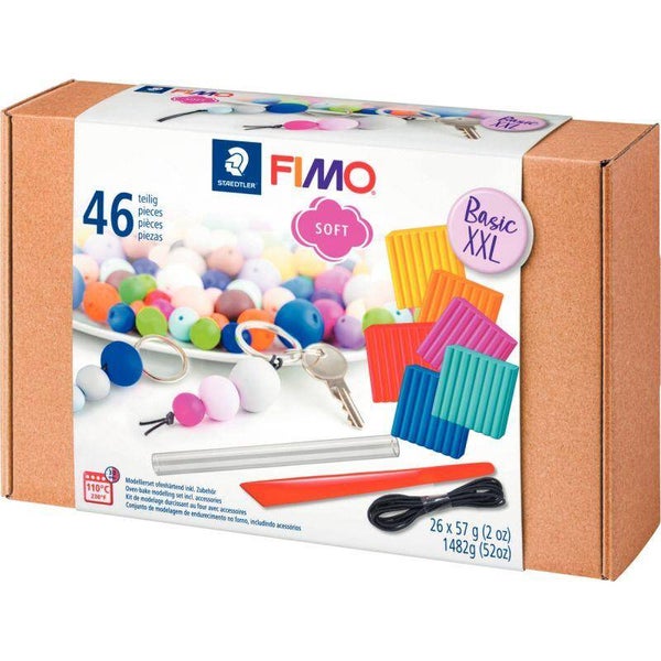 Deux nouveaux coffrets FIMO soft en kraft comprenant un mélange de pains et d’outils et accessoires de base pour se lancer dans la FIMO et créer ses premières réalisations. Contenu : 26 pains de 57grammes, 5 spatules de modelage, 5 rouleaux, 5 ficelles, 5 porte-clefs, 1 mode d''emploi